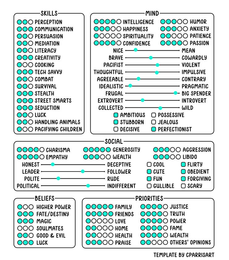 Habits: intrusive curiosity, tendency to be judgmental, coffee addiction